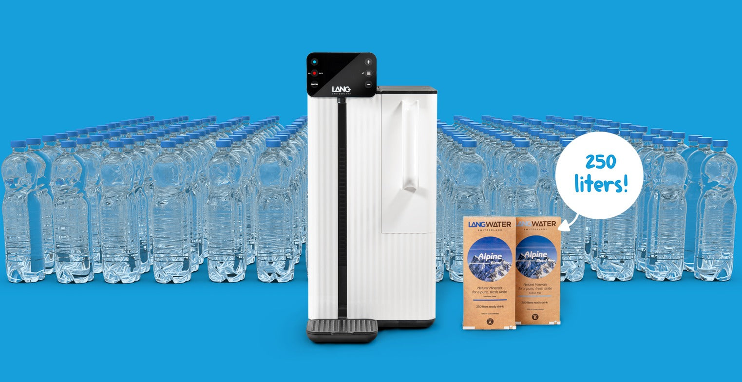 At LANG, we don’t use any single use elements. One Mineral set produces 250 liters of pure mineralized water, sparing you the hassle of heavy bottles and helping to protect nature.