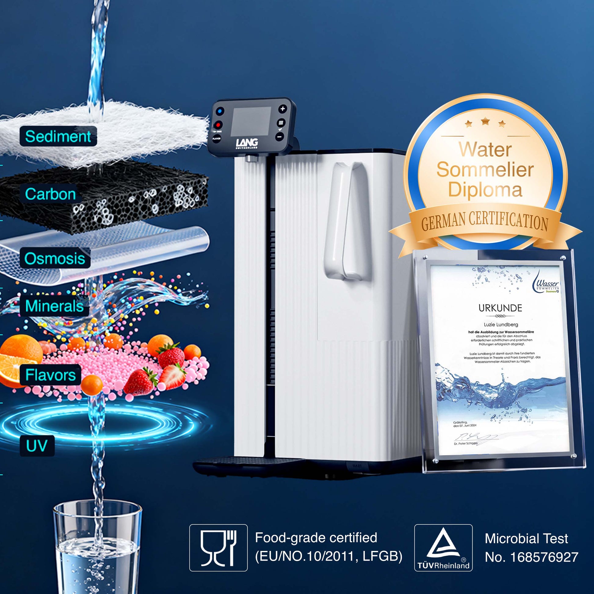 - Safest Swiss technology The osmosis machine delivers purified water instantly without the need for a storage tank, to prevent any post-filtration contamination. All components are tested & certified food grade. (EU/NO.10/2011)